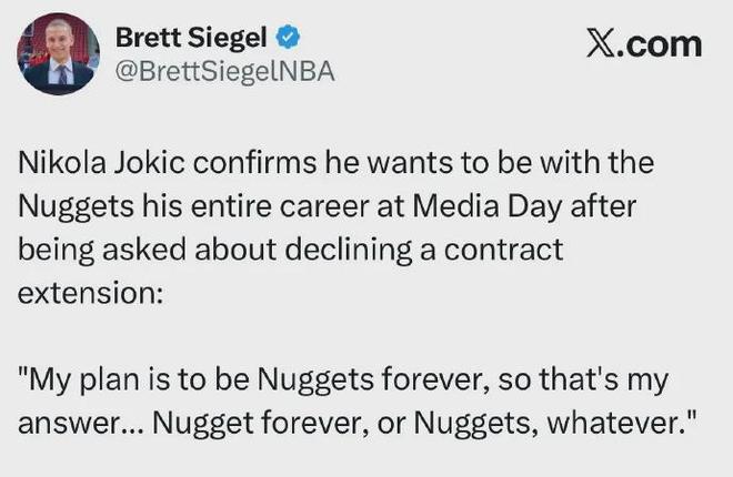 Jokic才在新赛季媒体日表达了希望永远留在掘金的愿望,今夏拒绝提前续约,是因为等到明夏可以签约四年约2.92亿美元超级顶薪。