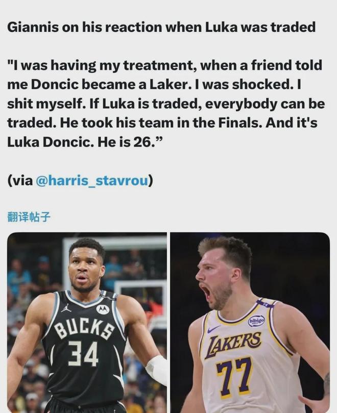 字母哥谈及东契奇被独行侠交易到湖人一事时,直言惊掉下巴,后者都能被交易那还有谁不能。