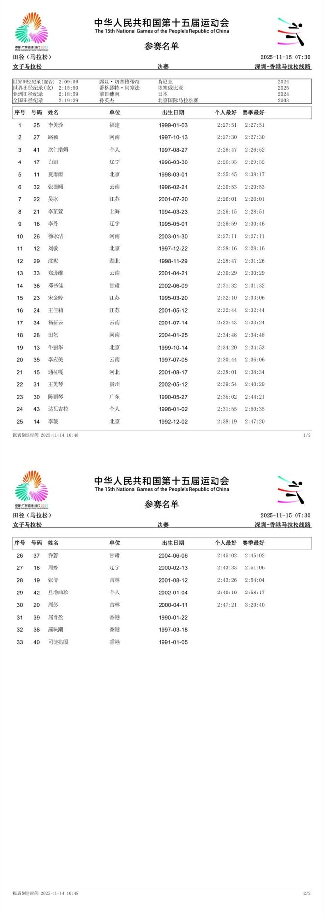 而且值得一提的是,在官方的全运会决赛名单中,PB在2小时30分以内的有12人,2小时33分以内的有19人,张水华的成绩在其中并不算多特别。这些获得参赛资格的专业选手,因为全运会年的缘故,并没有大量出现在城市马拉松赛场,但她们的水平有目共睹。
