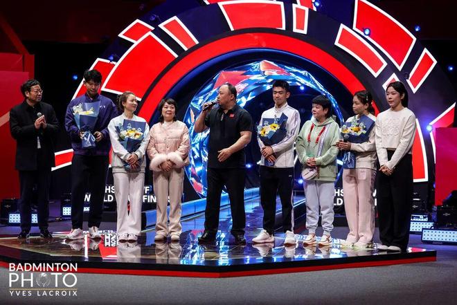 四位名将分别挑选了具有职业生涯代表意味的经典照片,刘雨辰选择了2023年苏迪曼杯的神奇逆转照,郑思维和黄雅琼选择的是东京和巴黎两届奥运会领奖台上的瞬间,陈清晨选择了2025年苏杯国羽夺冠大合照。之后,黄雅琼的父母、郑思维的妈妈、以及自称“今天是清晨的‘妈妈’”的最佳搭档贾一凡作为亲友团为他们送上鲜花和祝福。