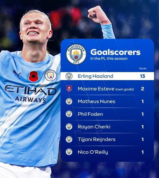 在昨天凌晨进行的英超第10轮比赛中,曼城主场3-1击败伯恩茅斯,其中哈兰德完成梅开二度, 尼科-奥赖利打进一球。根据统计,本赛季到目前为止,哈兰德在英超联赛中已经打进了13个进球,