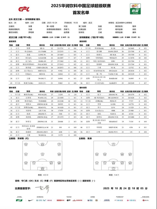 北京时间10月24日19:30,中超第28轮,武汉三镇坐镇主场武汉体育中心体育场迎战深圳新鹏城。本场主裁判张雷,VAR裁判为刘威。双方赛前公布首发名单。双方首发名单: